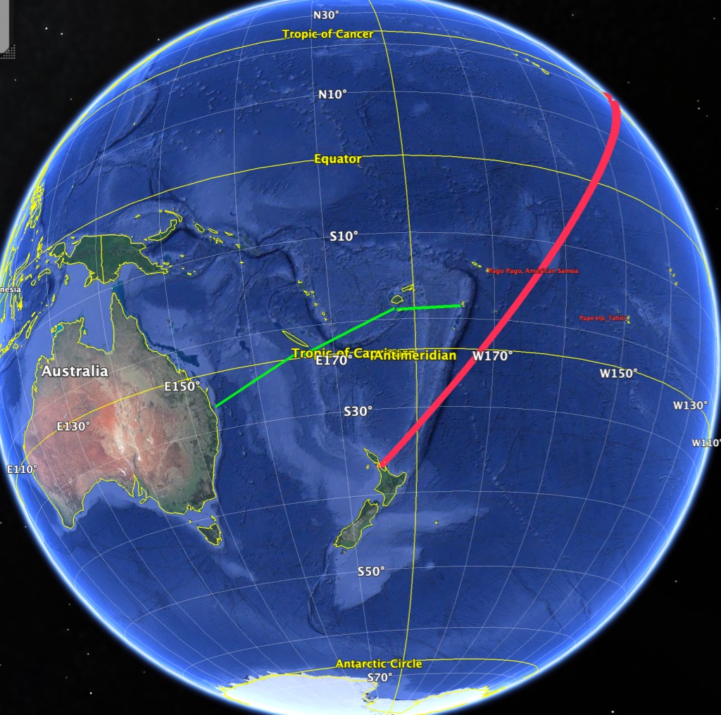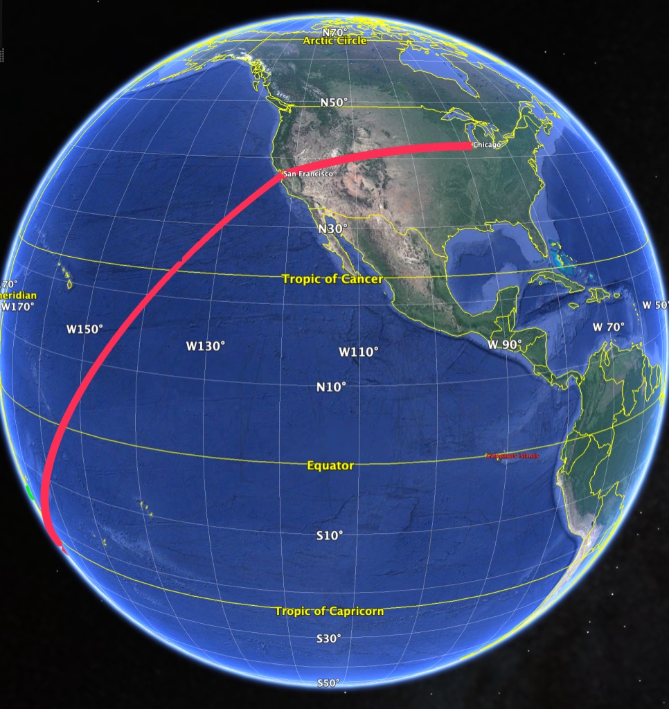 The red line below is our flight path with a stop in San Francisco to change planes. All maps from Google Earth.